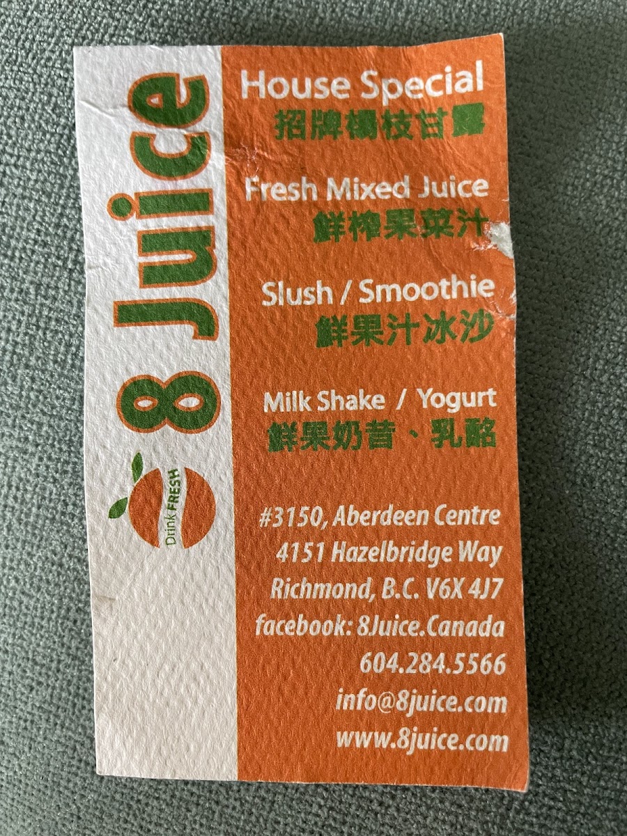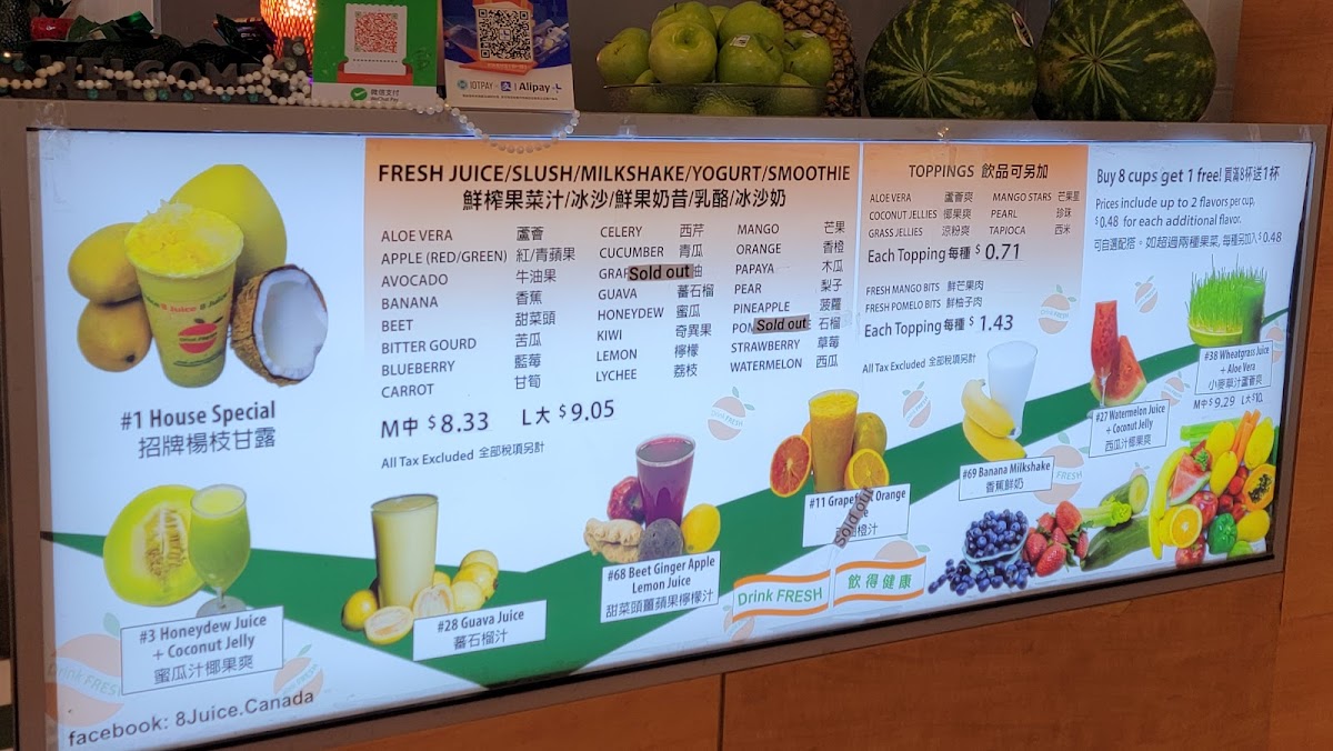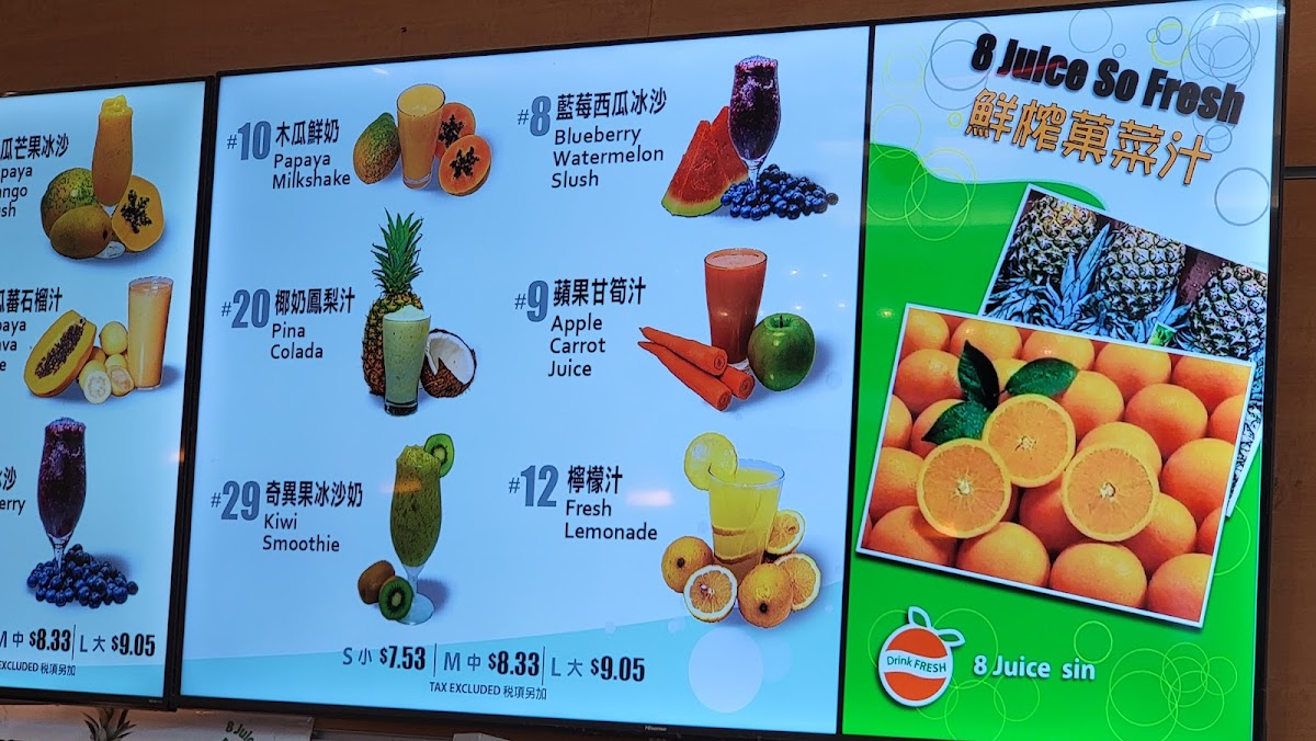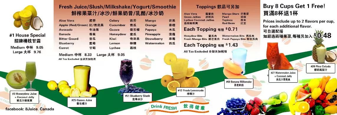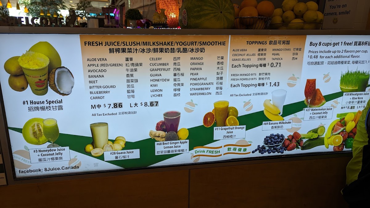 At 8 Juice, the menu reads like a celebration of fresh, fruit‑forward drinks with several standout options that reviewers and regulars often recommend. The signature House Special is a must‑try, listed at about CA$8.83, blending mango, coconut, tapioca and pomelo into a creamy tropical treat. Fruity favorites like Banana Strawberry Smoothie + Mango Jelly (≈ CA$8.83) and Papaya Smoothie + Tapioca (≈ CA$8.83) deliver classic smoothie comfort, while the bright and refreshing Honeydew Juice + Coconut Jelly also comes in around CA$8.83. For something a bit different, the creamy Coconut Milk + Grass Jelly checks in at roughly CA$8.83, and you’ll find inventive fresh juices and slushes such as five‑green blends, watermelon blueberry slush and apple-carrot juice rounding out the lineup. Whether you’re in the mood for a lush smoothie or a clean, cool juice, the menu’s variety ensures there’s something to suit every taste.
