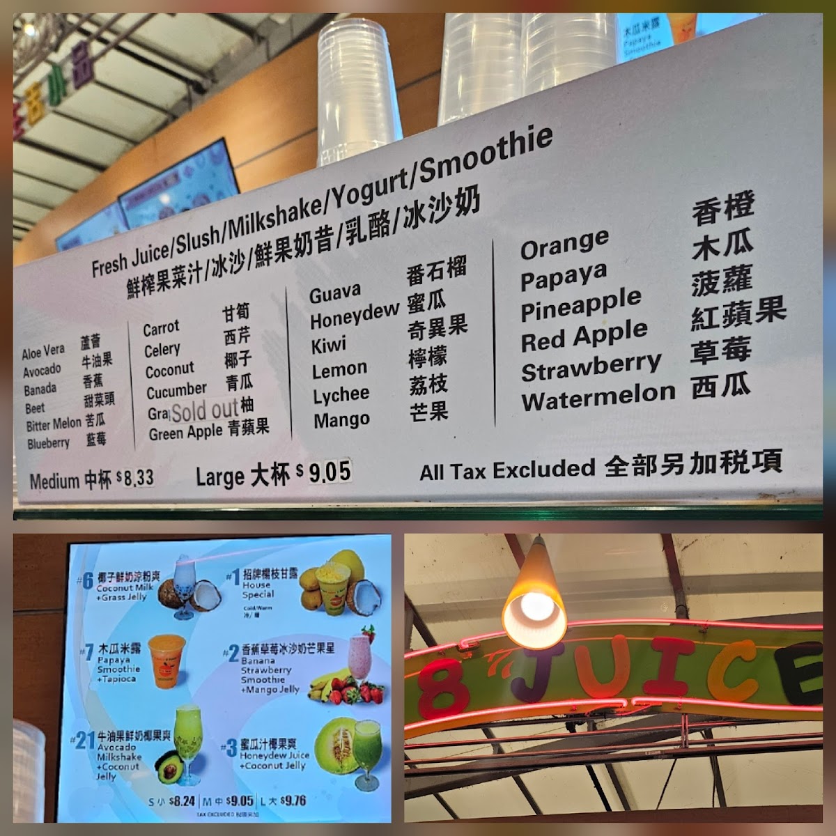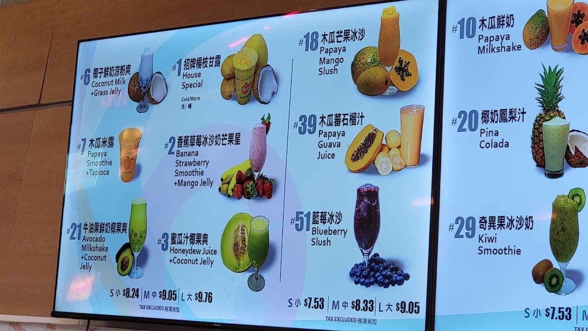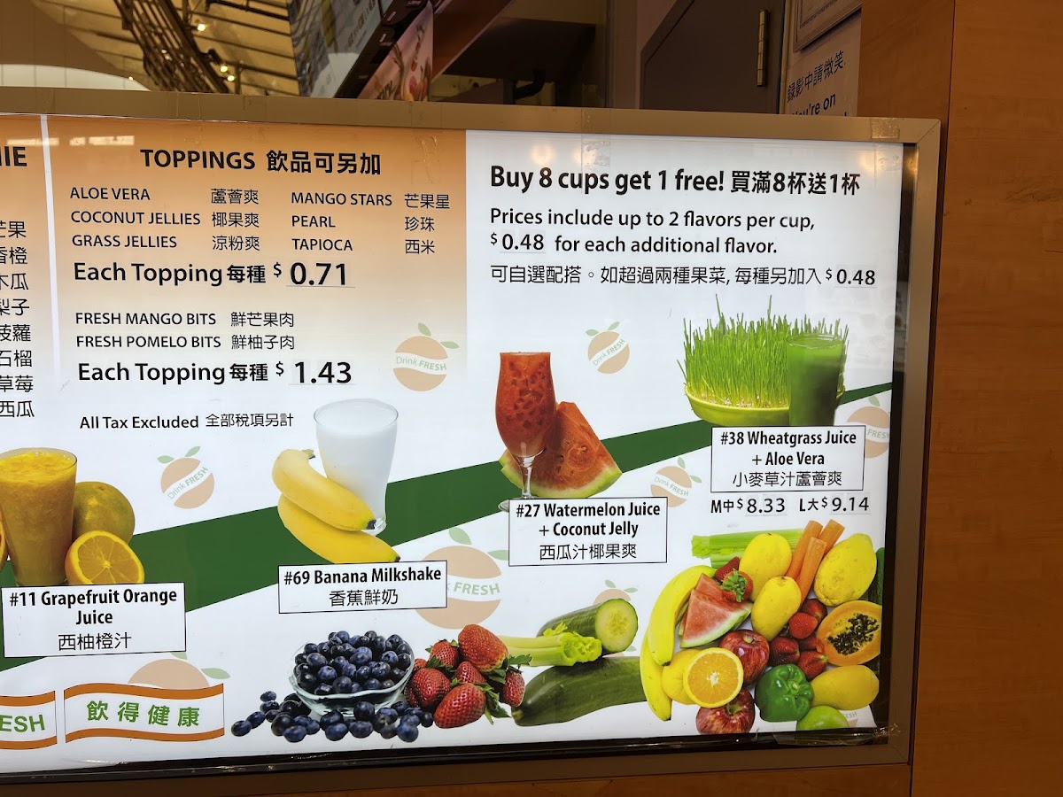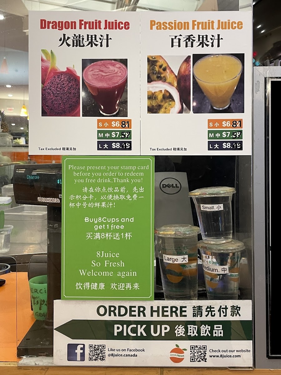 At 8 Juice, the menu reads like a celebration of fresh, fruit‑forward drinks with several standout options that reviewers and regulars often recommend. The signature House Special is a must‑try, listed at about CA$8.83, blending mango, coconut, tapioca and pomelo into a creamy tropical treat. Fruity favorites like Banana Strawberry Smoothie + Mango Jelly (≈ CA$8.83) and Papaya Smoothie + Tapioca (≈ CA$8.83) deliver classic smoothie comfort, while the bright and refreshing Honeydew Juice + Coconut Jelly also comes in around CA$8.83. For something a bit different, the creamy Coconut Milk + Grass Jelly checks in at roughly CA$8.83, and you’ll find inventive fresh juices and slushes such as five‑green blends, watermelon blueberry slush and apple-carrot juice rounding out the lineup. Whether you’re in the mood for a lush smoothie or a clean, cool juice, the menu’s variety ensures there’s something to suit every taste.